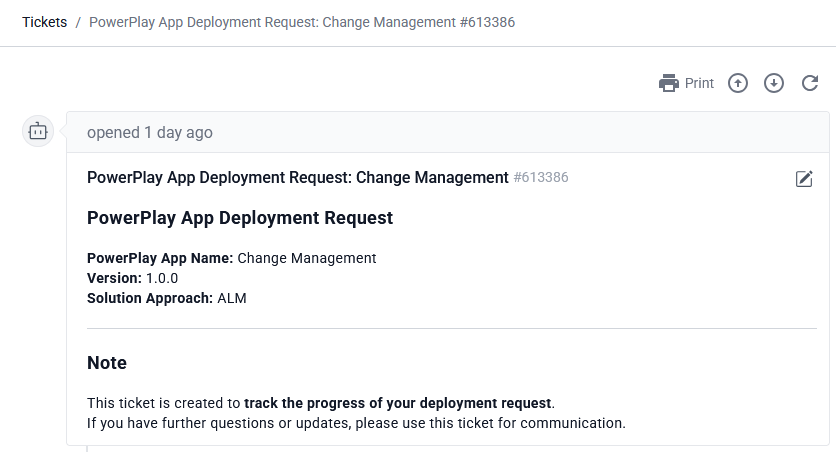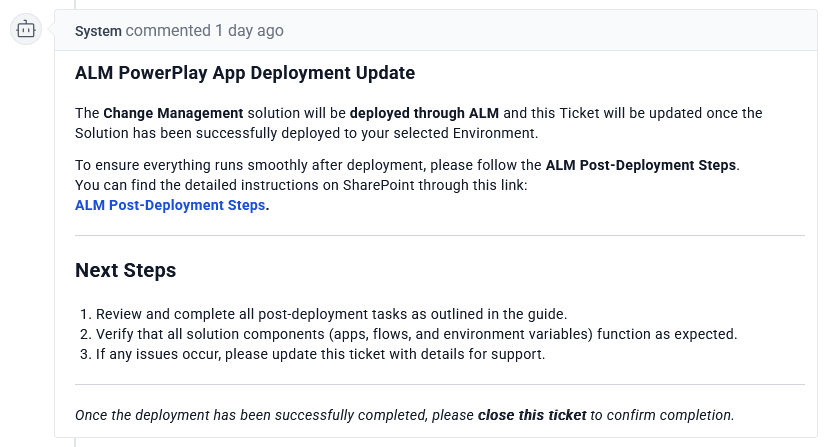 - Once the deployment is finished, you will see an update on the ticket reporting that the deployment was successful