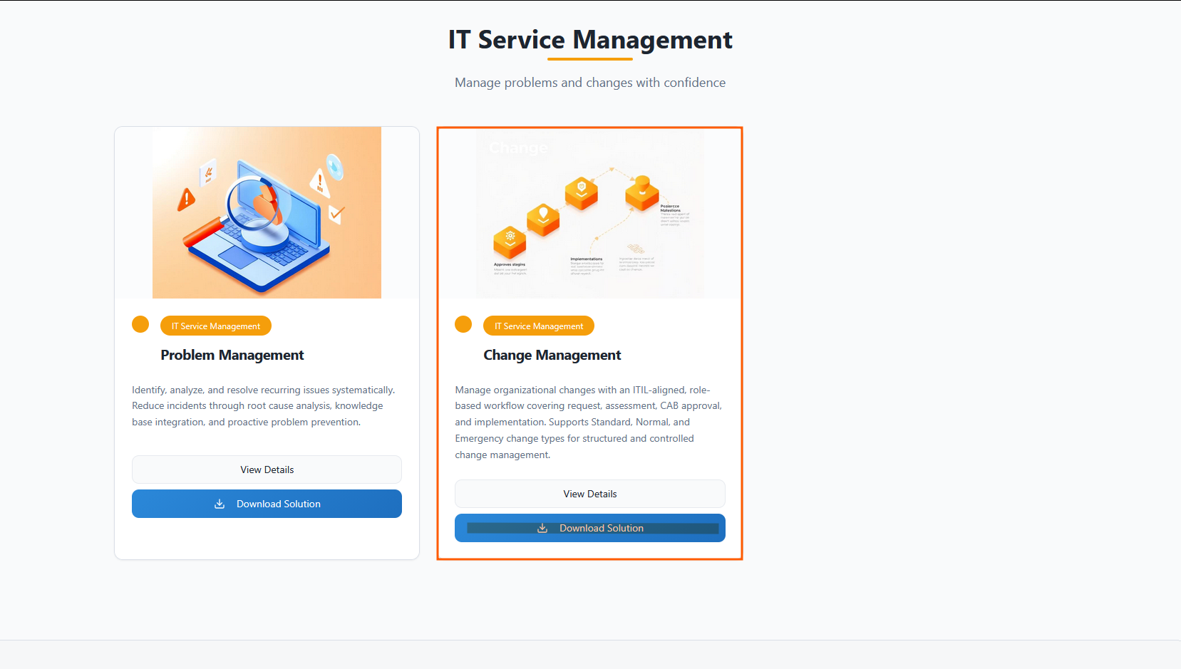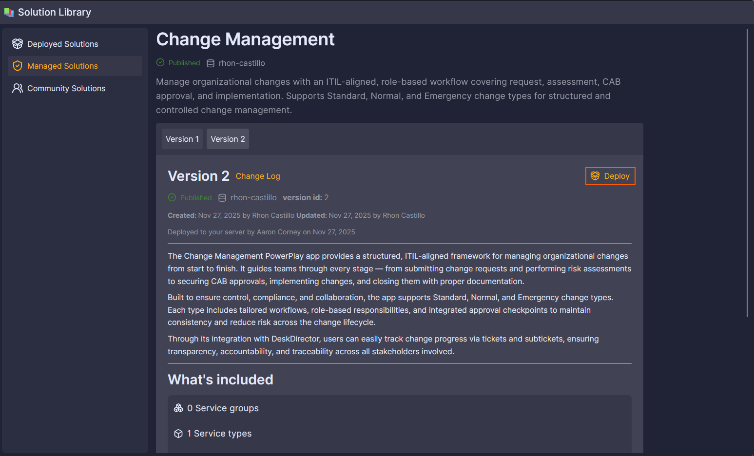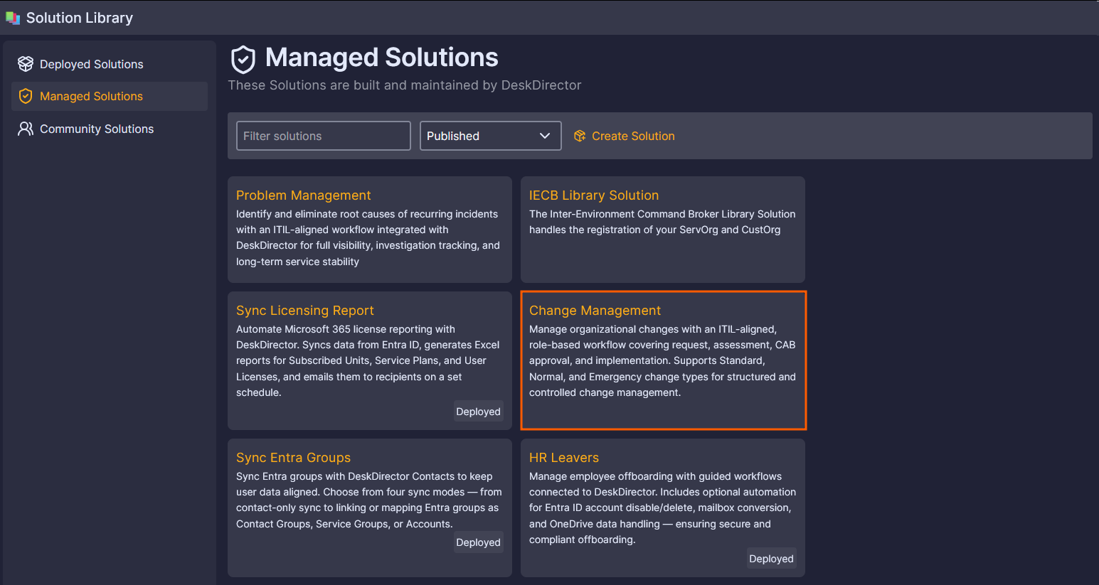 Integrations>Solution Library. - Select the Managed Solutions tab and open the Change Management solution: