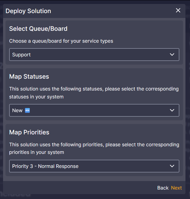 On this page, you can also see a version history as well as a list of features that will be deployed. - Follow the on-screen prompts to select a Queue/Board, Status, and Priority: