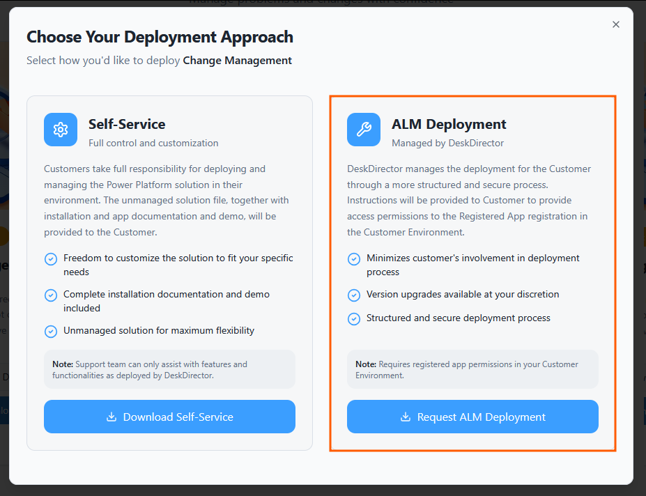 For the deployment to work, you will need to deploy the solution library, then deploy either the ALM or self-service solution.
