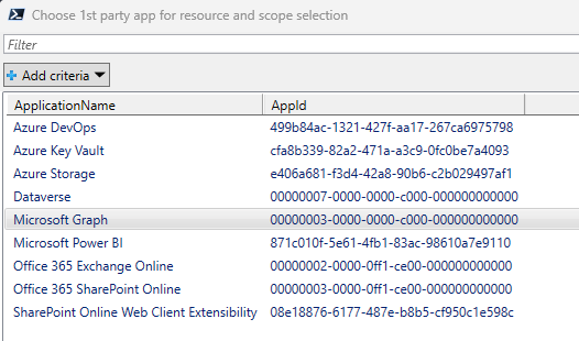 Microsoft Graphfrom theChoose 1st party app for resource and scope selectionpop-up - Search and select